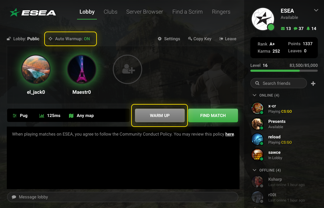 Whether it’s honing that all important muscle memory, breaking in a new sensitivity or piece of equipment, or practicing quick flicks, deathmatching is one of the traditional methods of warming up for pugs for many players. The ESEA team is pleased to announce an experimental new quality of life improvement for our PUG experience called Warm Up. Starting today the ESEA Client will now display an option to “warm up” featured in the lobby, which will send the player to an ESEA deathmatch server, either before queuing or while in queue. Once a PUG is found the player will be automatically transferred from the deathmatch server into the PUG server. Our goal is to provide a streamlined experience for players wishing to get their deathmatch on without having to worry about changing servers or re-launching CS:GO, and encourage players who might not otherwise deathmatch to give it a try. This initial launch of Warm Up has the following features:
